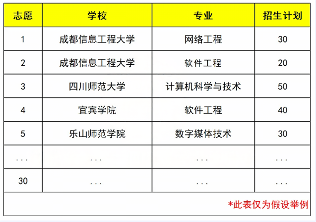 每个志愿包含1所招生院校和该校的1个招生专业,即“1所院校+1个专业”为1个志愿,考生根据实际情况填写1至30个志愿。可以填同一所学校的多个专业,也可以填同一个专业的多个学校。