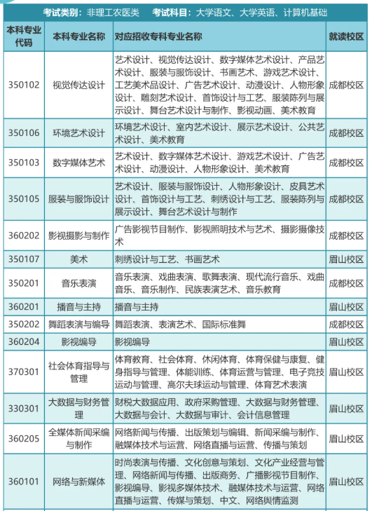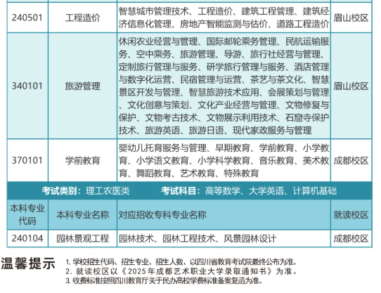 2025年成都艺术职业大学四川省普通高校专升本招生简章发布,招生专业有视觉传达设计、环境艺术设计、数字媒体艺术、服装与服饰设计、影视摄影与制作、美术、音乐表演、播音与主持、舞蹈表演与编导、影视编导、社会体育指导与、管理、大数据与财务管、理、全媒体新闻采编、与制作、网络与新媒体、工程造价、旅游管理等。