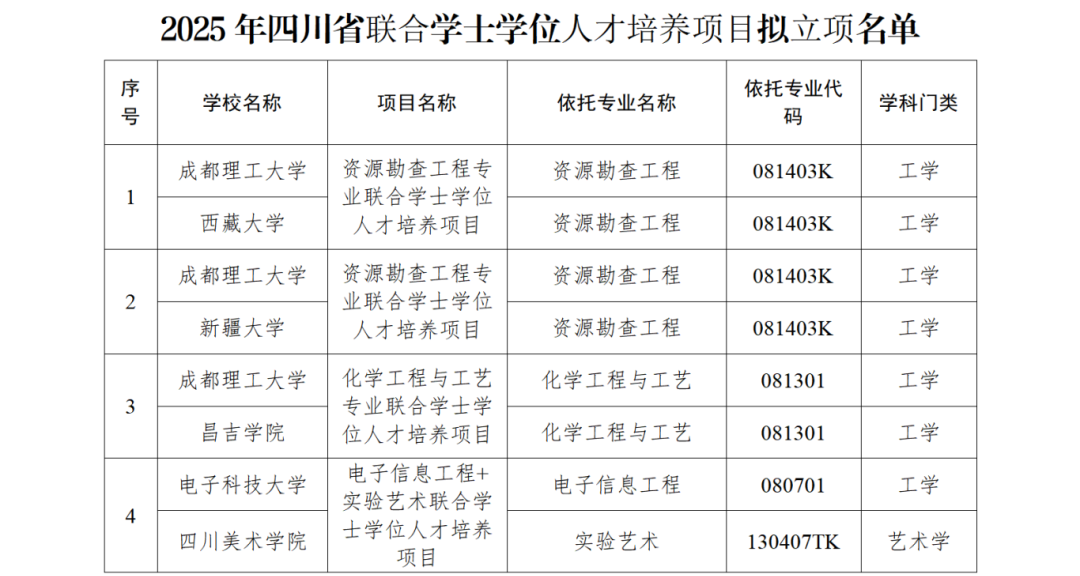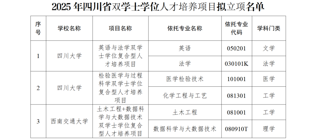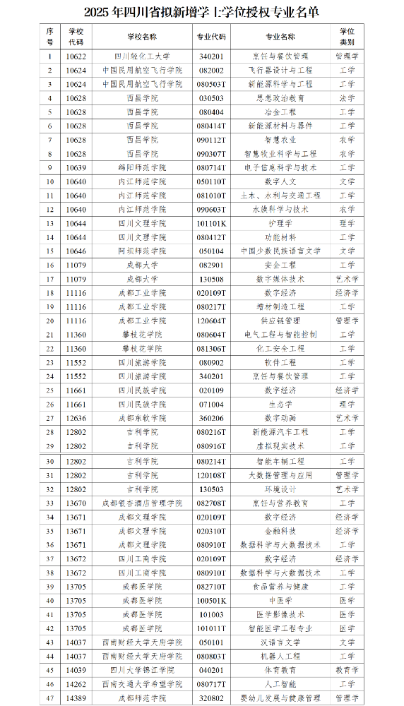 四川省人民政府学位委员会办公室发布《关于2025年新增学士学位授权专业、双学士学位及联合学士学位人才培养项目名单的公示》2025年四川高校拟新增47个学士学位授权专业、3个双学士学位复合型人才培养项目、4个联合学士学位人才培养项目详细名单一起来看